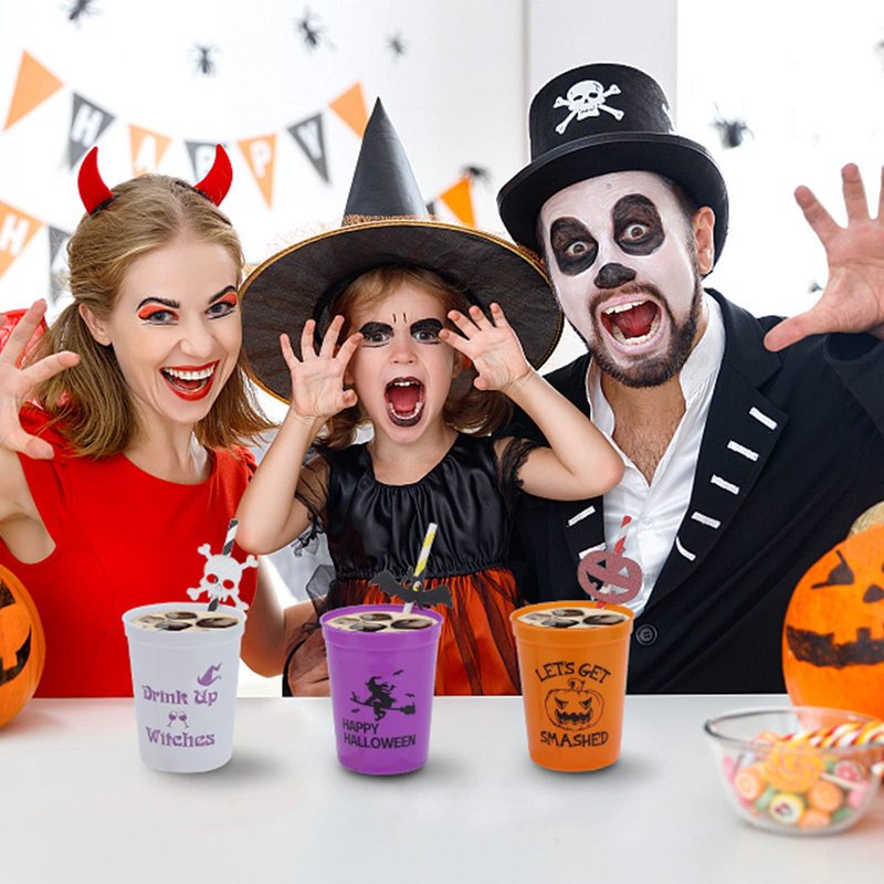 - STYLISH DESIGN : Our package contains 3pcs "Let's Get Smashed !" Cups,3pcs "I'm Just Here For The Boos " Cups !,3pcs "Happy Halloween" Cups,3pcs "Drink Up Witches" Cups and 12pcs Halloween party disposable drinking paper straws.Perfect for your Halloween party !