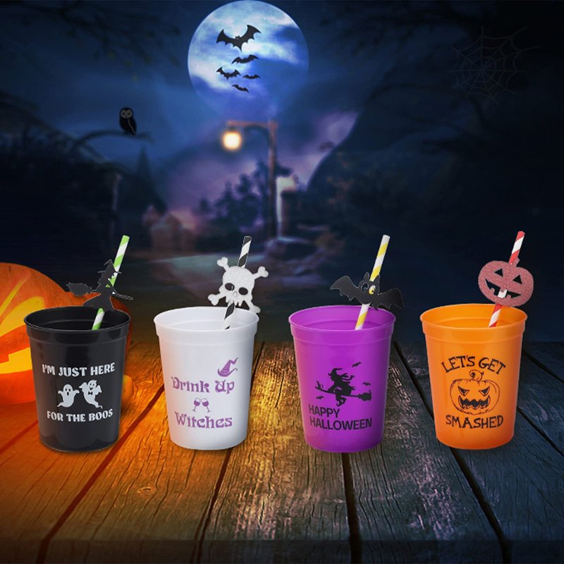 Ainibar Halloween Plastic Party Cups - Set of 12 16oz Stadium Cups and 12 Halloween Party Disposable Drinking Paper Straws,Perfect for Halloween Party Supplies