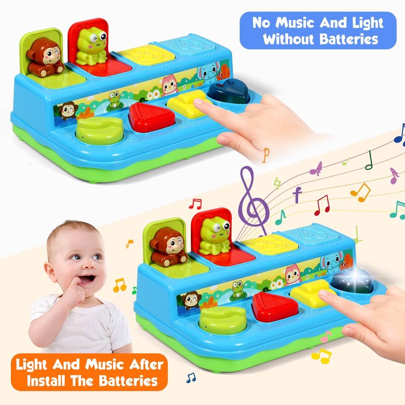 - This baby toys will making corresponding animal sounds music and light when the adorable animals pop up and close after installing 2 AA batteries(not include). If you want baby toys 6-12 months to be quieter, turn off the switch or without batteries, the animals can still pop up, but there will be no music and lights.