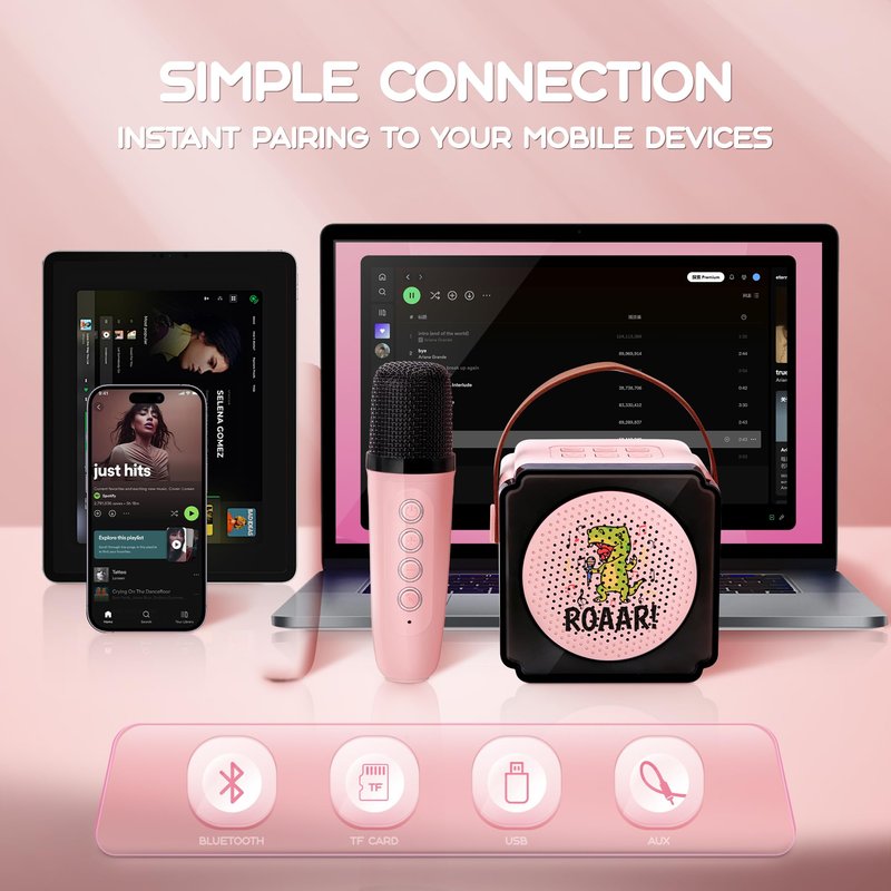 Multifunctional Kids Karaoke Machine: The kids karaoke machine has a built-in Bluetooth 5.3 chip to ensure instant pairing, provide stable transmission, and provide a 32-foot distance connection. Enjoy easy connection with TF card, USB and AUX input ports and use it with mobile phones, tablets, PCs and iPads for a truly versatile karaoke experience.