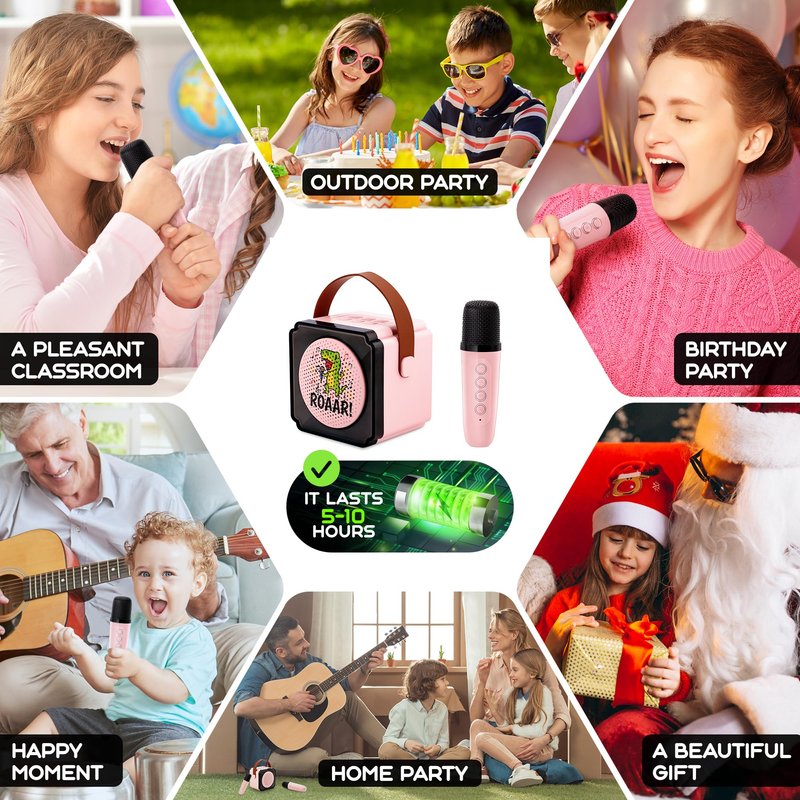 - Multifunctional Karaoke Machine --The mini karaoke machine comes with a voice changer, which can be easily switched through the button on the microphone. You could see the kids laughing hard when transform from normal to funny voice changing effects. Great fun for both boys and girls. Whether in the classroom, in the car, or at family events, the mini karaoke machine's built-in colored light effects can create a happy atmosphere.