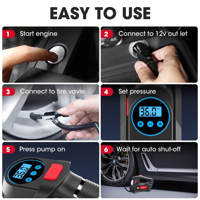 - FAST INFLATING SPEED & EASY TO USE:Simply plug it into the 12V power outlet in your car and attach the hose to the tire you wish to inflate. You can just flip the switch and the car air compressor will do all the work for you.The maximum pressure of car tyre pump is 150PSI and the air flow is 35L/min. It can inflate the 195/65/R15 car tire from 0 to 35psi under 5 minutes.It is more efficient and faster than traditional pumps. (Note: not suitable for truck tires)