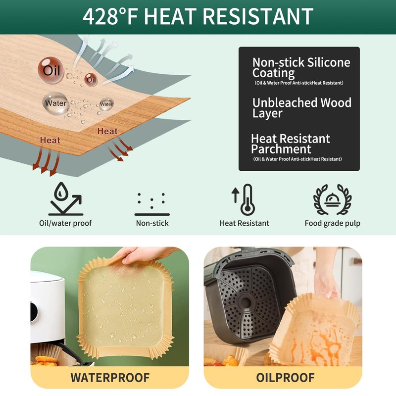 - 【Food Grade Reliable Materials】The air fryer disposable paper is made from 100% food-safe parchment paper, unbleached, and with a double-sided silicone oil coating. High-quality material is Waterproof, oil-proof, and grease-proof that can withstand temperatures up to 428℉. Food will not stick to the liner surface and retain the flavor.