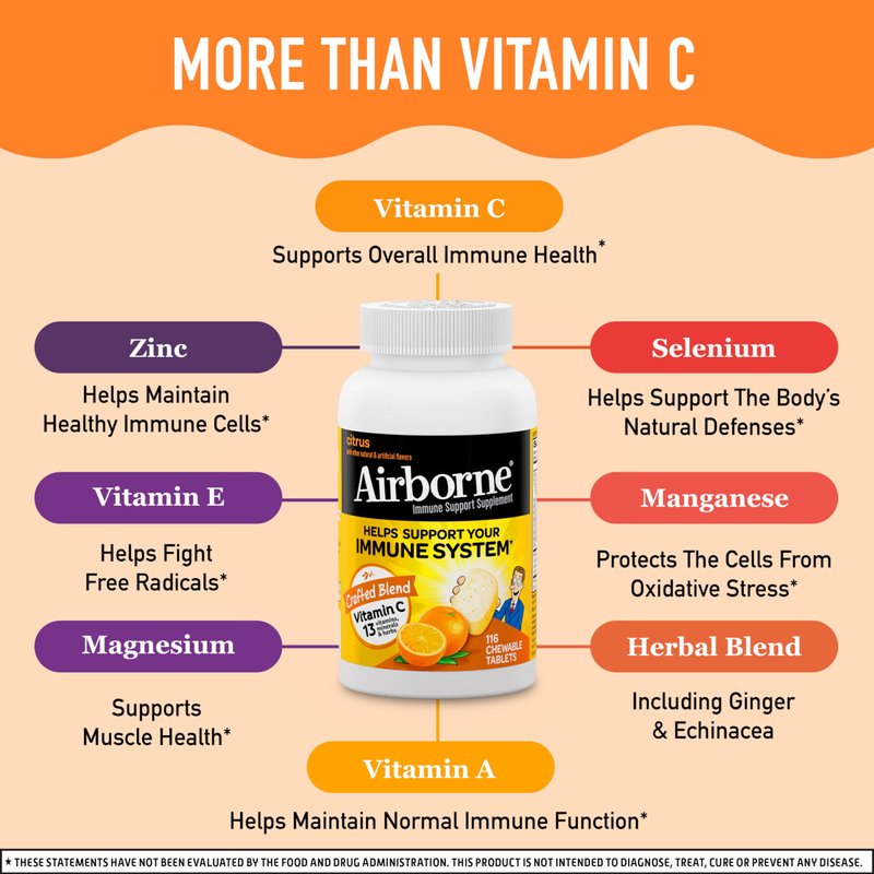 Airborne 1000mg Vitamin C Chewable Tablets with Zinc, Immune Support Supplement with Powerful Antioxidants Vitamins A C & E - (116 count bottle), Citrus Flavor, Gluten-Free