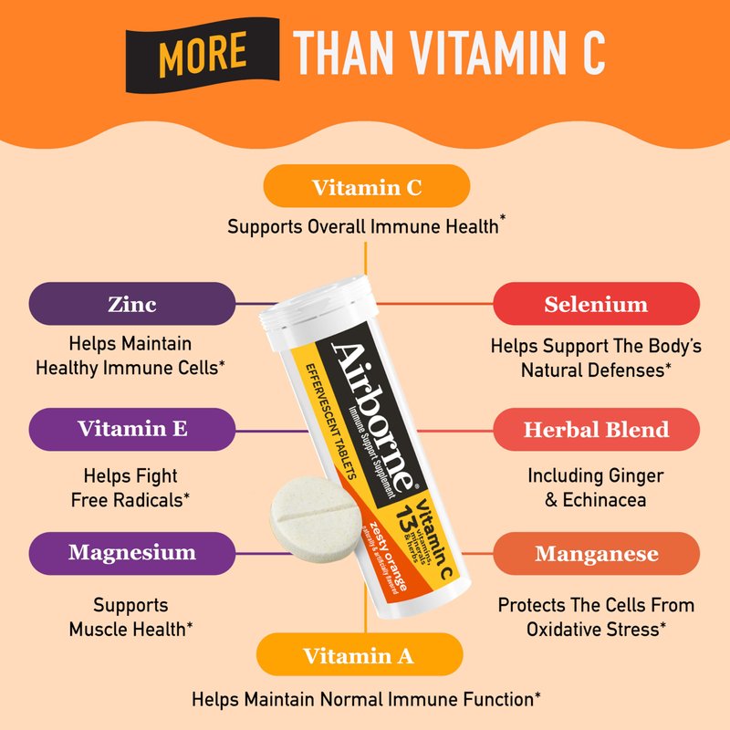 - VITAMIN C 1000mg: Airborne immune support effervescent tablets are packed with 1000mg Vitamin C per serving, which helps support your immune system.*