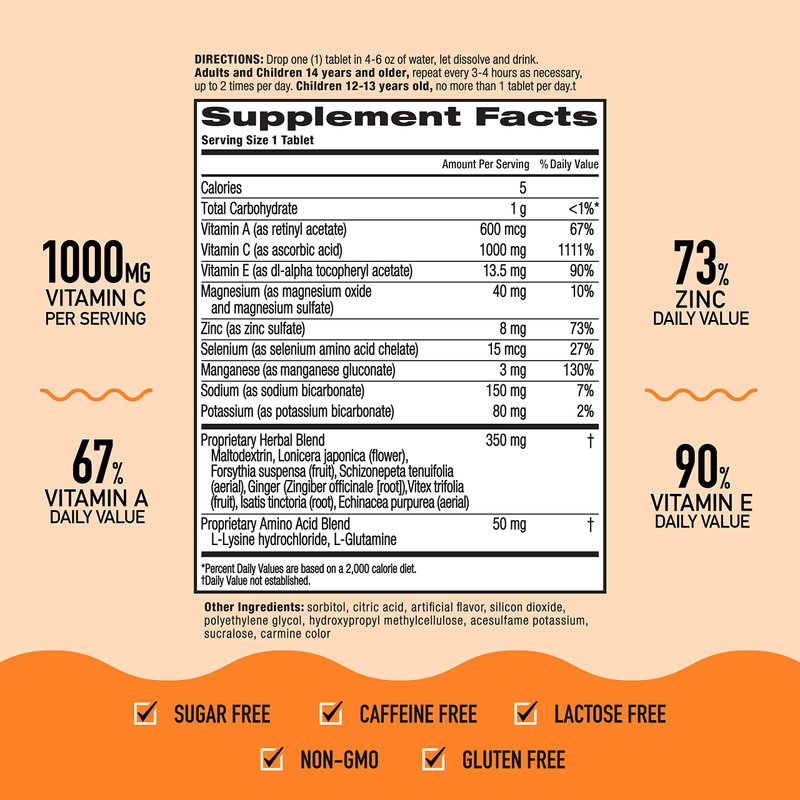 - ZINC SUPPLEMENT: These Vitamin C with Zinc effervescent tablets contain 73 percent of your daily value of Zinc, which plays a central role in your immune system and is essential for the functioning and signaling of immune cells..