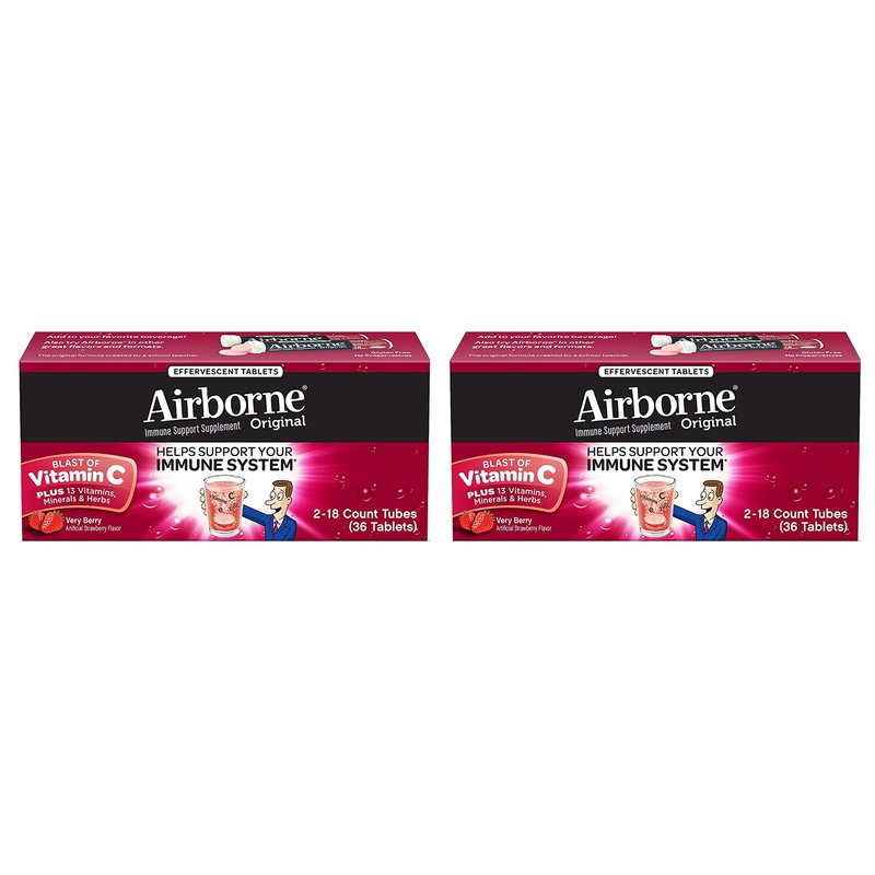 Airborne Effervescent Tablets provide real immune support in a great-tasting and fast absorbing formula. Deliver a blast of 1000 mg of Vitamin C plus 13 other immune system supporting vitamins, minerals, and herbs, including Echinacea, ginger, and other herbal extracts from whole plant materials.