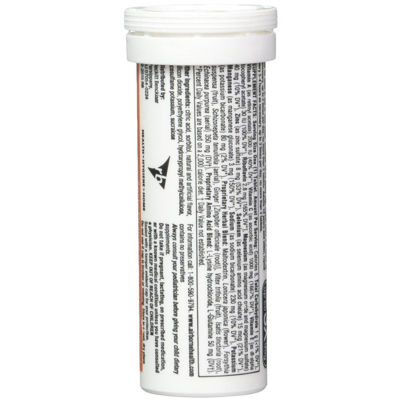 Airborne's unique natural formula contains 17 herbs and nutrients, including ginger for nausea! Clinical trial data is available. No artificial colors or preservatives. Seven herbal extracts! Antioxidants! Electrolytes! Amino Acids! 1000 mg of Vitamin C! Tastes great! Airborne is proud of the fact that we import no powdered herbs. To ensure safety, purity and potency, we do our herbal extracting in America using whole plant material.