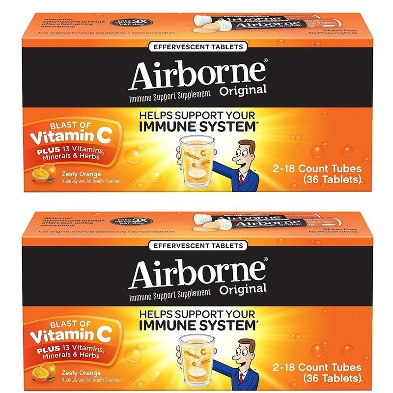 Airborne Effervescent Tablets provide real immune support in a great-tasting and fast absorbing formula. Each serving (1 tablet) delivers a blast of 1000 mg of Vitamin C plus 13 other immune system supporting vitamins, minerals, and herbs, including Echinacea, ginger, and other herbal extracts from whole plant materials.