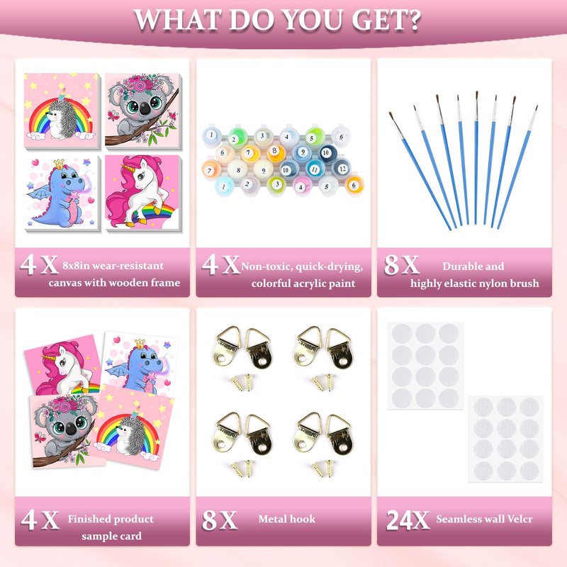 - PAINT BY NUMBER KIT INCLUDE:16 wall velcro stickers, 4 canvas with wooden frame 8x8in,8 hanging hooks, 8 brushes, 4 clear legend reference card,and enough paint materials. This kit contains all the tools a beginner needs.