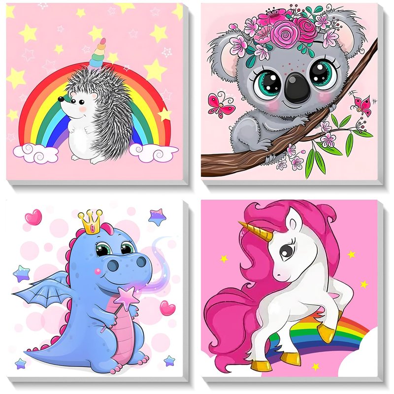 AIRDEA 4 Pack Paint by Number for Kids with Wooden Frame,Cartoon Paint by Numbers for Kids Ages 4-8-12,Easy Paint with Numbers 8X8 Inches (Grey White Blue Purple)