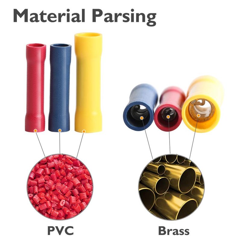 - HIGH-QUALITY MATERIAL: Wire butt connectors are made of top brass ( tin-plated finished ), PVC insulation
