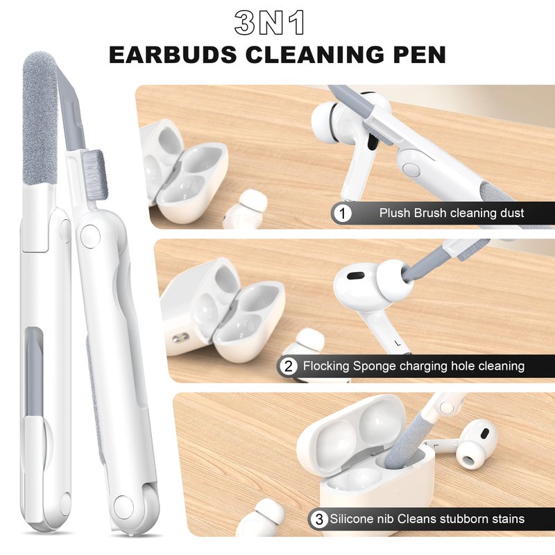 - 【Multi-functional Cleaning Pen】 The cleaning Kit has Silicone nib to remove dirt from hidden cracks and holes. The soft flocked sponge absorbs fine dust inside the wireless earbuds charging case. The high-density brush can easily clean the dirt on the sound hole of the earphone.