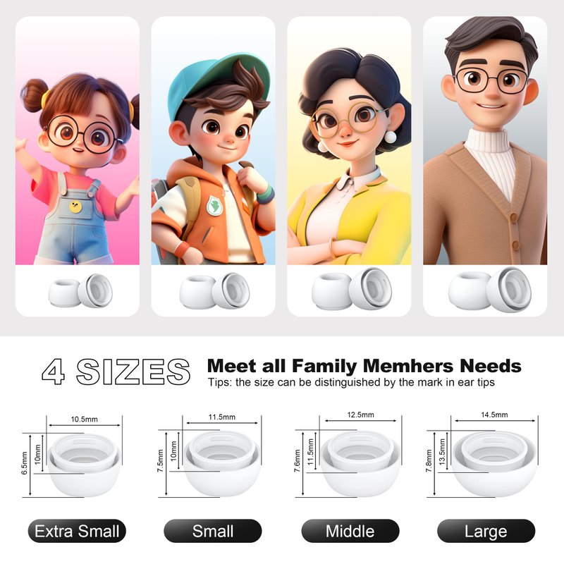 AirPods Pro 2nd Generation/1st Generation Earbuds (8 Earbud mounting Slots with Noise-canceling Holes and Built-in dust mesh), USB-C Charging Cradle, and Cleaning kit. 4 Pairs (XS/S/M/L), White
