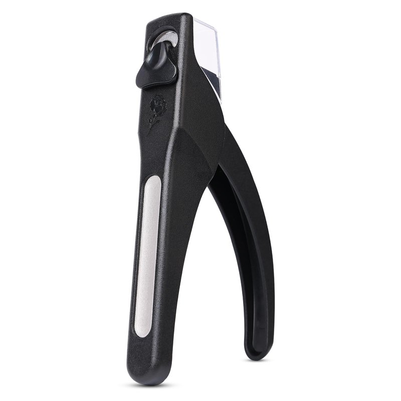 Hold the acrylic nail clippers with the faceplate facing backwards at a 45-degree angle to the acrylic nail that will be inserted. Insert the nail tip into the cutting slot and press the handle to cut it.