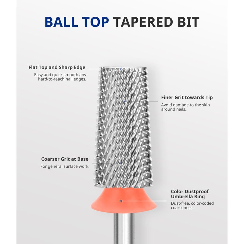 - Shape: Flat Top Tapered Barrel; The tapered shape nail drill bit includes a finer grit at the tip of the bit to avoid any damage to cuticles and surrounding nail walls and a coarser grit towards the base of the bit for faster nail bed surface work