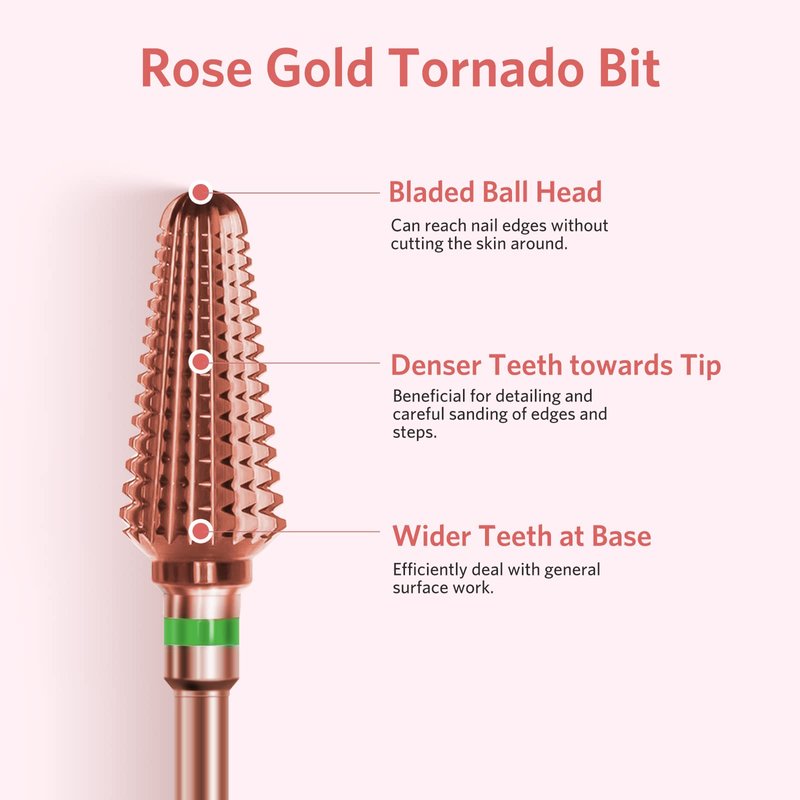 - [Shape] Rose Gold Tornado Bit: The drill bit is balled at the top with the tornado shape body can easy and quick smooth any hard-to-reach nail edge area without cutting the skin around, and it includes a finer grit at the tip of the bit to avoid any damage to cuticles and surrounding nail walls and a coarser grit towards the base of the bit for faster nail bed surface work.
