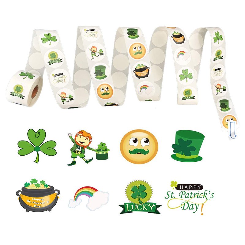 - Colorful Variety: This St. Patrick's Day Roll Stickers pack contains 500 stickers, each with a range of colors, shapes, and designs to ensure you can showcase your creativity when celebrating St. Patrick's Day.8 kinds of styles: treasure bowl/Cute emoji/Happy St. Patrick/Shamrock/Elves/Luck Shamrock/hat/rainbow