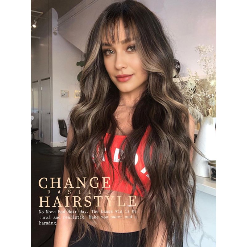 - [Realistic Bangs & Highlight Colors] The wig with bangs is a popular style at present, which can trim your forehead, and make you look sweet. The most popular wavy curls make you look more attractive. At the same time, brown with highlight hair color can brighten your skin color, and light color can make the wig more active. It must be your wish list and your first choice as a surprise.