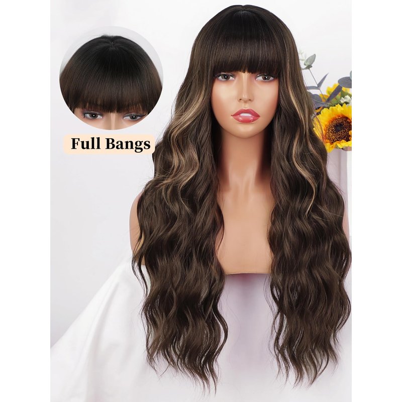 AISI QUEENS Brown Wig with Bangs for Women Long Wavy Hair Wig Brown Highlight Wig Curly Wavy Synthetic Wigs for Girls Daily Party Use