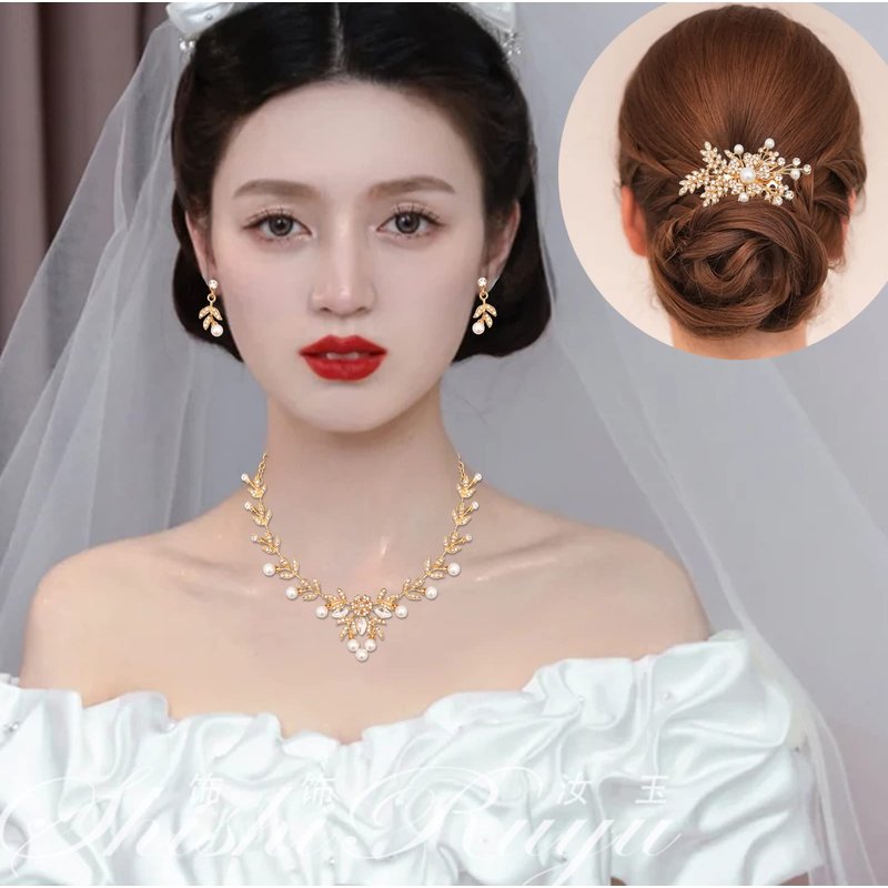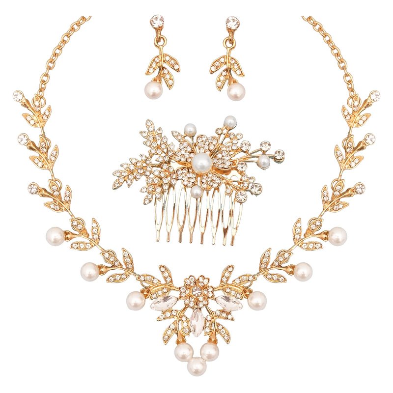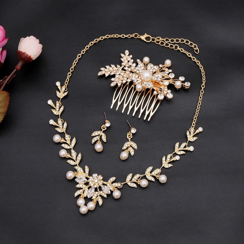 - Gold Plated Costume Jewelry Set Includes 1pc Necklace, 1 Pair Dangle Earrings, 1pc Hair Comb, Perfect Wedding Dress Jewelry Set for Prom, Bridal, Bride and Bridesmaids