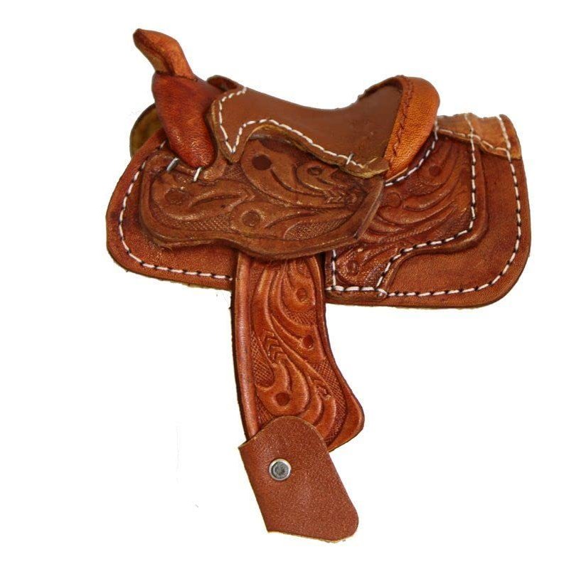 2" seat miniature leather saddle for decoration. Hand made with genuine tooled leather, fleece back. Great for craft projects or can be used as a western décor. This is a hand made product, some may have minor cosmetic imperfection. Size: 4 1⁄4" long x 3" wide