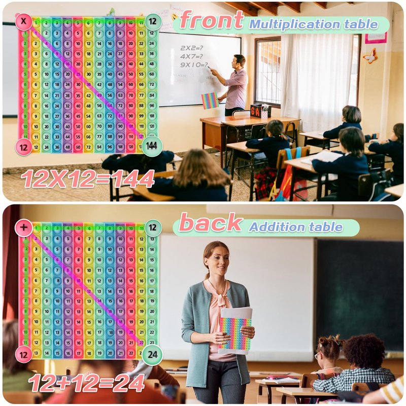 - 【Multiplication game Table Addition Math Toy with Flash Cards】 Developed by educators, this toy features a multiplication 12X12 chart on the front side and a number 0-12 addition table on the back side, also come with flash cards that printed multiplication formula. It can help teachers create more math teaching methods, make children's learning process easier and more fun, and make children fall in love with learning.The multiplication table and the addition table are combined into one.