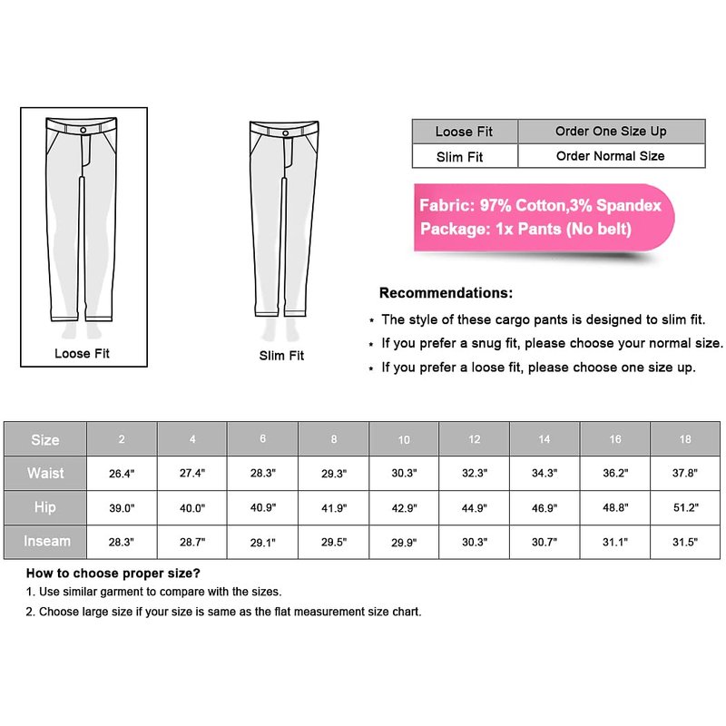 - ♥♥RECOMMENDATIONS: If you prefer a snug fit, please choose your normal size. If you prefer a loose fit, please choose one size up. Womens cargo pants are perfect gift for your family and friends. Sweat-absorbent, Wear and stain resistant. The belt is not included. Cold Hand/ Machine Wash.
