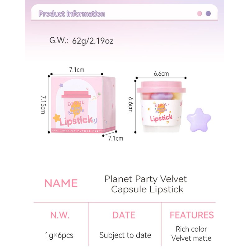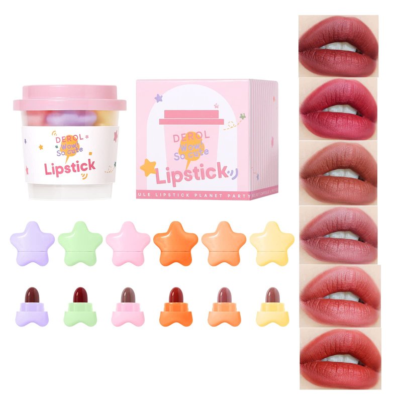 - AKARY 6 Colors Cute Star Lipstick: The mini lip stick set contains 6 beautiful classic candy colors, silky and not dry, compact, and light, which is a gospel for girls with difficulty in choosing. It's awesome to be able to have glamorous lips of different colors every day for one week! The best choice to meet the various makeup needs of different occasions.