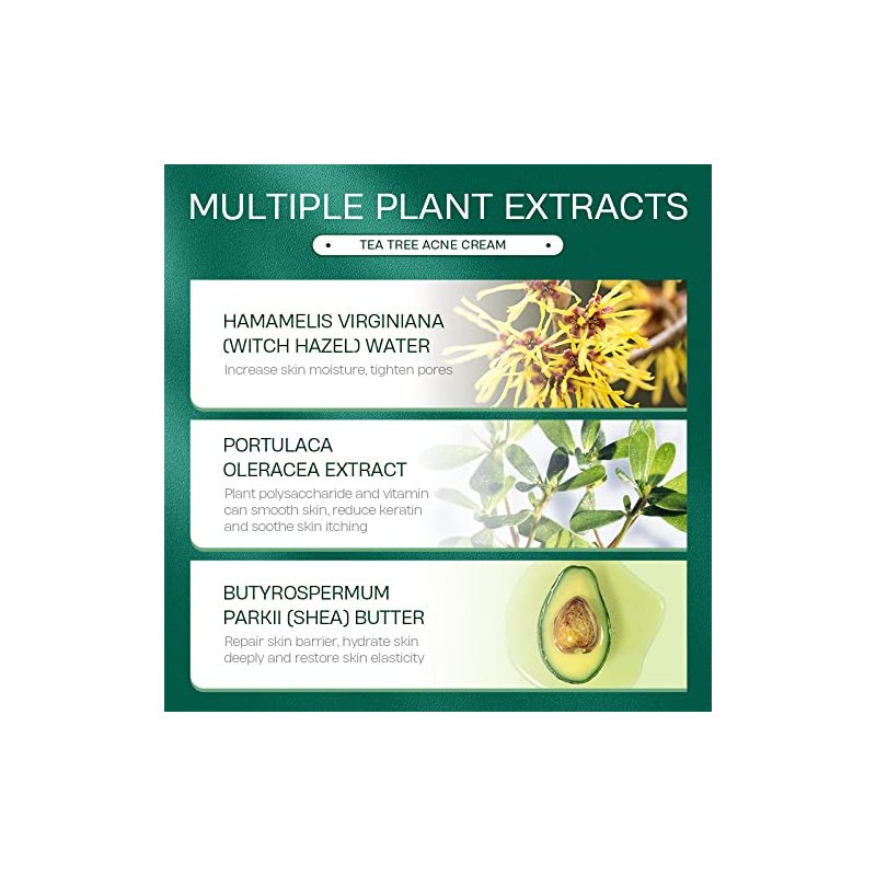 - Not Greasy, Non Comedogenic, Acne Face Cream & Absorbs Easily - This tea tree oil acne cream for face is not going to cause more breakouts as other acne face creams - Mild plant extracts formulated: Melaleuca Alternifolia (Tea Tree) Leaf Oil, Butyrosperumum Parkii (Shea) Butter, Hamamelis Virginiana (Witch Hazel) Water, Portulaca Pleracea Extract, to keep you moisturized while helps you to get rid of acne.