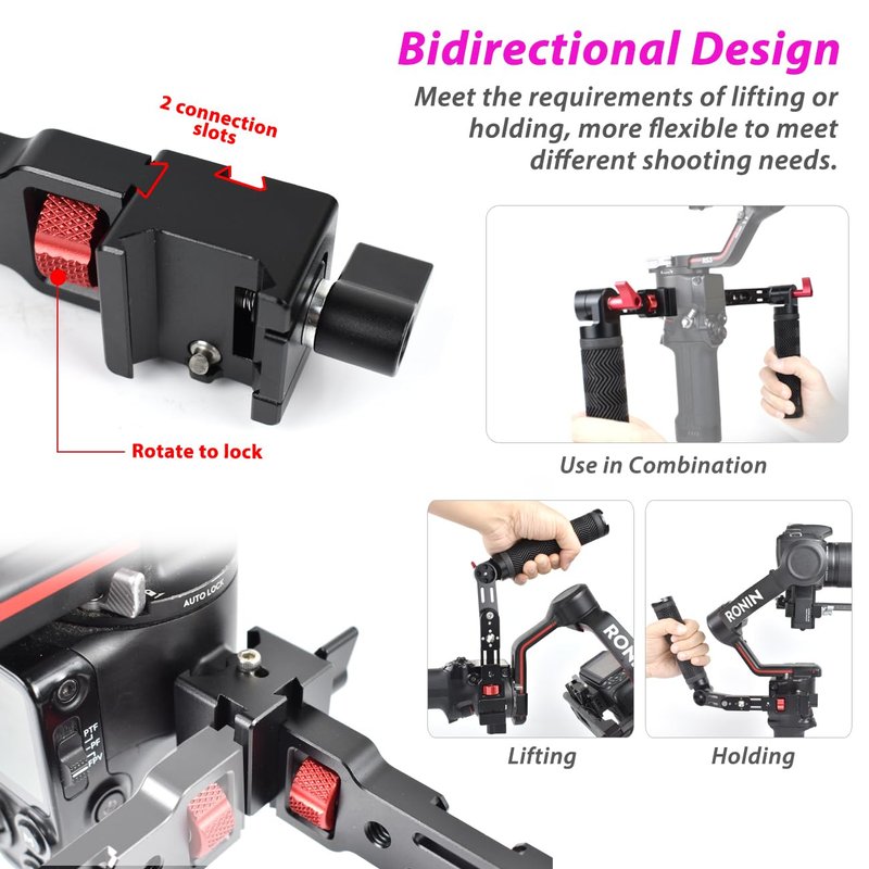 - 【Rich expandability】This gimbal handle comes with 2 × 1/4" holes, 2 × 3/8" holes (one for Arri positioning) and 2 × cold shoe mounts, with rich expandability to meet shooting needs. Helps you mount monitors, fill lights, microphones and other accessories on gimbal.