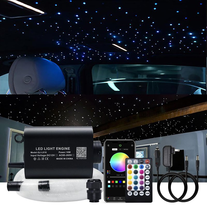 - 【SPECIFICATION】28key RF remote control. With 150pcs 6.5ft/2m end glow fiber optic cable in diameter 0.75mm(welcome to customize other size of fiber cable). With US power adapter and car use plug so that no need to connect wire and you can use for home or car as you like.
