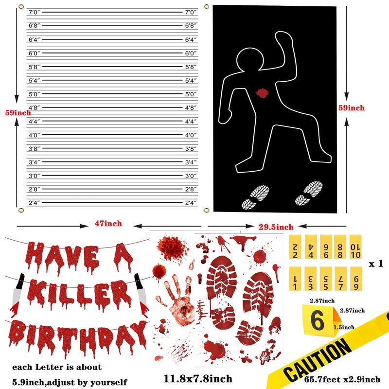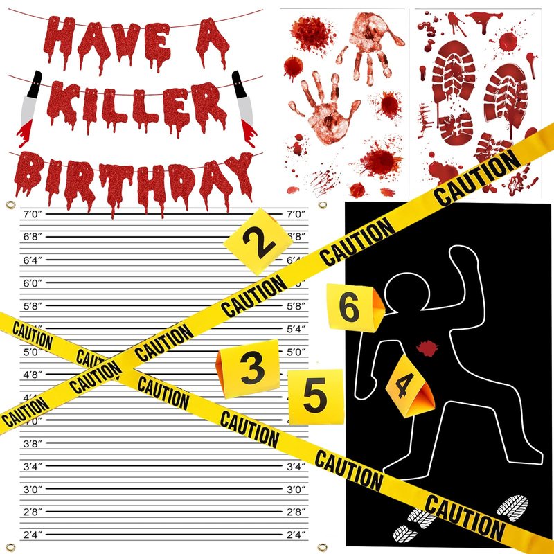 - PACKAGE INCLUDES:Crime scene decoration included 1x red have a killer birthday banner,1x crime scene body silhouette,1 x mugshot backdrop,1 x bright yellow CAUTION tape,10 x photo evidence markers with 0-10 number and 2 x window clings handprint footprint blod footprint sticker ,these will fill all of you need in murder detective party