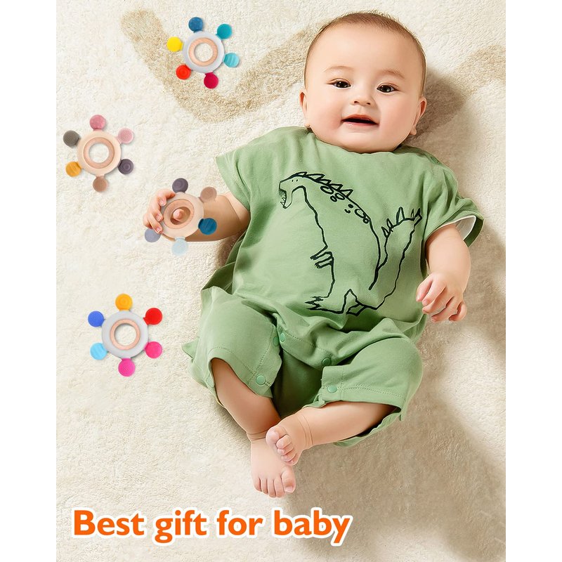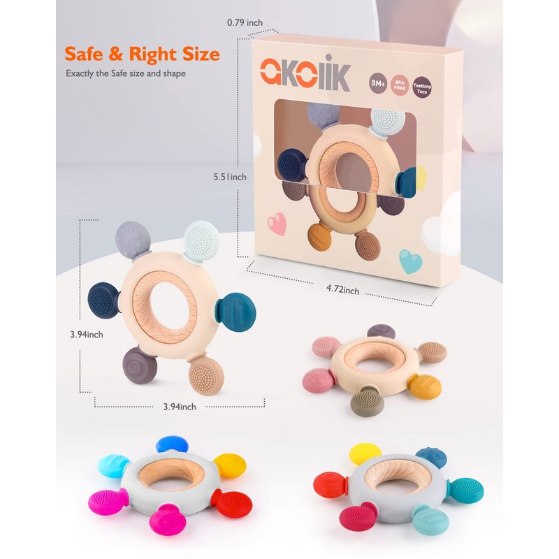- SAFE MATERIAL:Teething toys baby teether made of 100% premium food grade silicone and natural beech, soft and tough, non-toxic, FDA and BPA free and phthalate free, completely safe for babies.