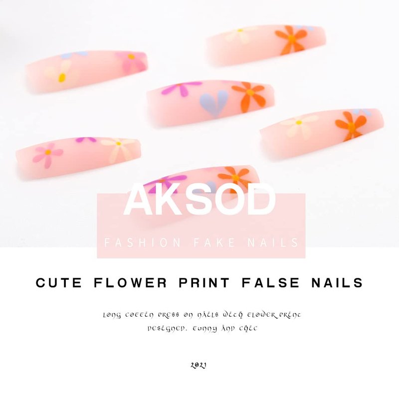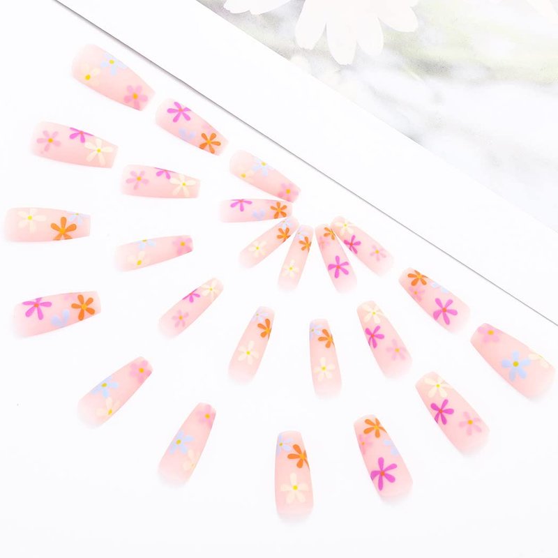 Aksod Colorful Press on Nails Matte Long Coffin Fake Nails Desinged Pink Artificial Flower False Nails Full Cover Rustic Ballerina Nails Tips for Women and Girls 24Pcs (C)