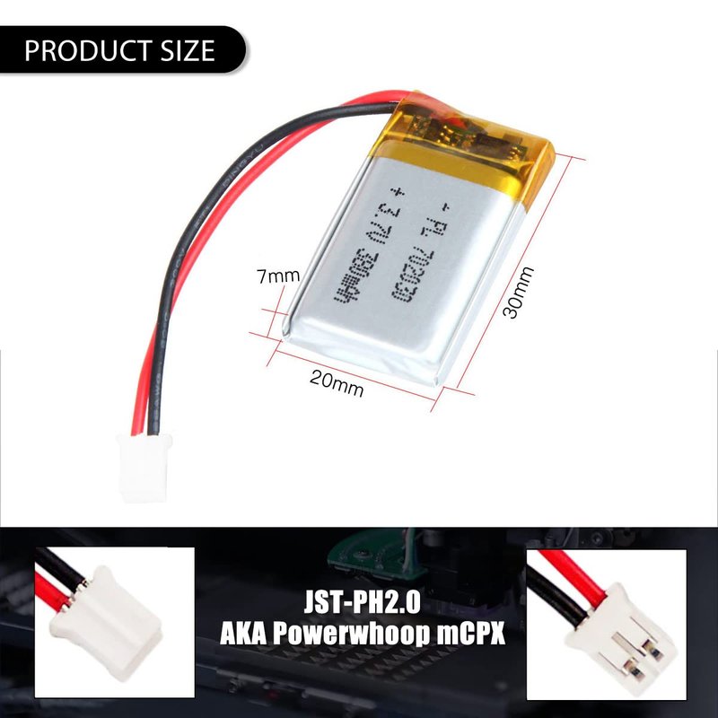 2.Our rechargeable lithium polymer ion battery connectors types are all JST PH2.0mm. Before ordering, please make sure the battery size and connector fit your battery.