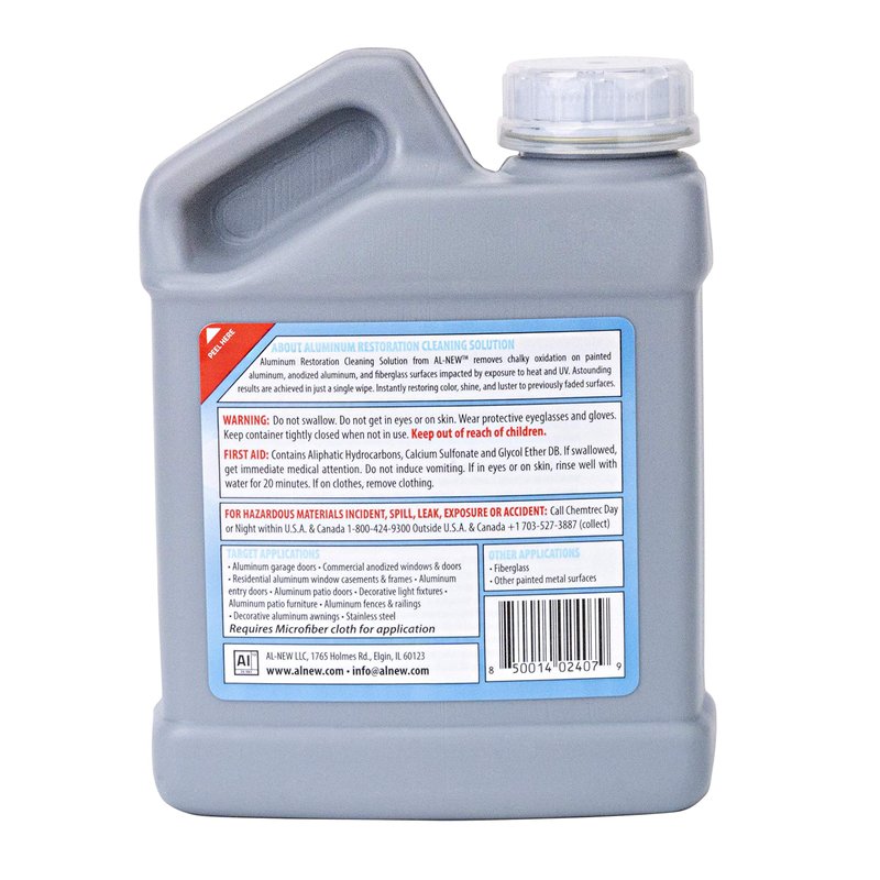 Choose AL-NEW Aluminum Restoration Solution to remove chalky oxidation and instantly refresh your aluminum and metal fixtures back to their original shine and luster. Simply wipe it on to clean and restore aluminum garage doors, decorative lighting fixtures, patio furniture, garden sheds, railings, mailboxes, gates, fences, and much more! Aluminum restoration solution from AL-NEW removes chalky oxidation on painted aluminum, anodized aluminum, and fiberglass surfaces impacted by exposure to heat and UV. Astounding results are achieved in just a single wipe, instantly restoring color, shine, and luster to previously faded surfaces. Aluminum Restoration Solution cleans and removes chalky oxidation from aluminum and other painted metals in a single pass. Once dried, the product leaves a coating of corrosion protection for the treated surface. The product is designed to work with limited to no pre-cleaning. Directions: requires microfiber cloth for application. No longer feel frustrated lose their luster after one season of harsh summer sun. Don't spend hard-earned money to replace or just accept that the weather has gotten the best of your valuables, let AL-NEW make everything new again. Restore, protect, and shine like AL-NEW! Made in the USA.