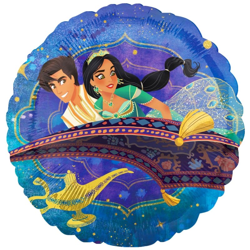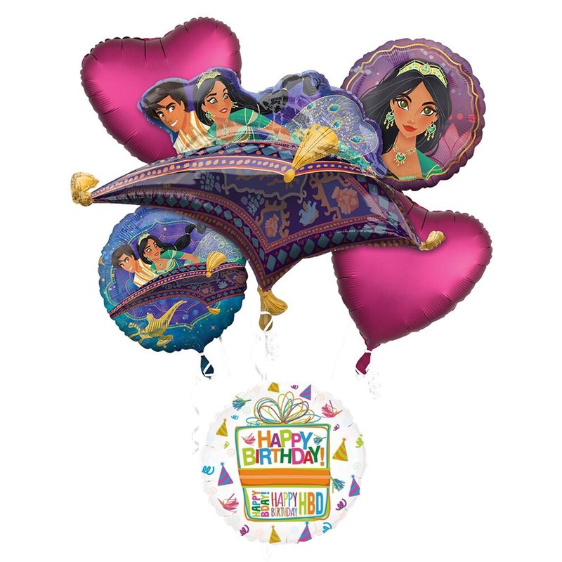 - (1) 42" Aladdin Flying Carpet Foil Balloon, (2) 17" Round Princess Jasmine Foil Balloons, (2) 18" Luxe Pomegranate Heart Shape Foil Balloons and (1) 18" Mayflower Products Happy Birthday Present Foil Balloon. Inflate balloons same day of event. Ribbon Not Included. All Anagram Licensed Foil Balloons are Made in USA. Founded in 1977, Anagram International leads the world in innovating and manufacturing foil balloons.