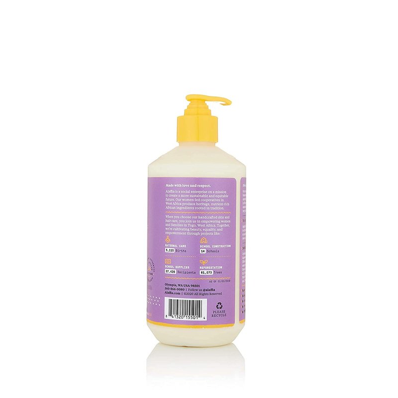 Alaffia's body lotion is prepared with Ethically Traded unrefined shea butter, calming lemongrass, antioxidant-rich shea leaf and lavender. For EveryDay use on normal to very dry skin.