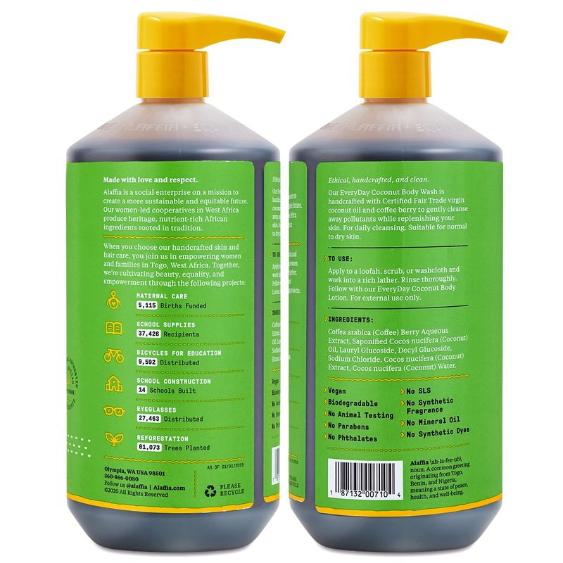 - RECOMMENDED COCONUT BODY WASH USE: Gentle on the skin for daily use, apply our women’s and mens body wash to a loofah, scrub or washcloth and work into a creamy lather. Rinse thoroughly and dry skin before applying Alaffia Everyday Coconut body lotion.
