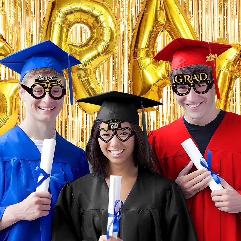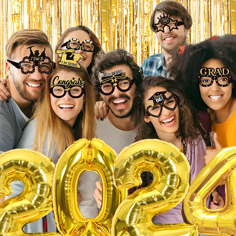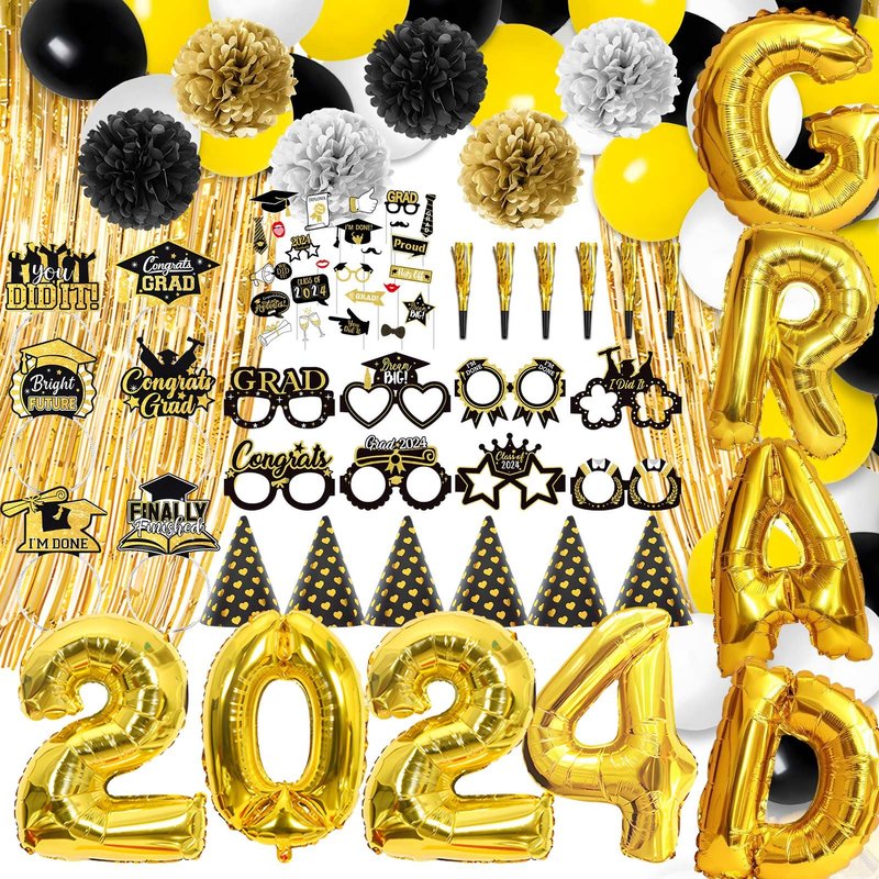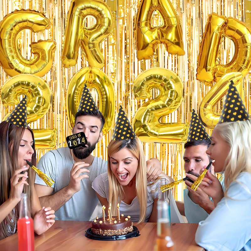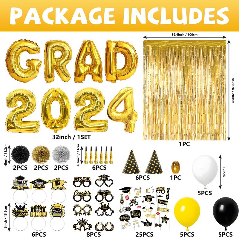 - 2024 Graduation Party Supplies - You'll get 32“ gold 2024 *1 + 32” gold GRADUATE *1, + gold rain curtain 1×2M *1, + 12“ white balloon *5, 12” gold balloon *5, 12” black balloon *5, + 10m gold laser ribbon *1, hat *6, gold blowing dragon *6pcs, + 6pcs*hair band, 8*decorative glasses, 25pcs*photo props, 6*paper flowers (black *2, gold *2, silver *2) 2, Silver*2).
