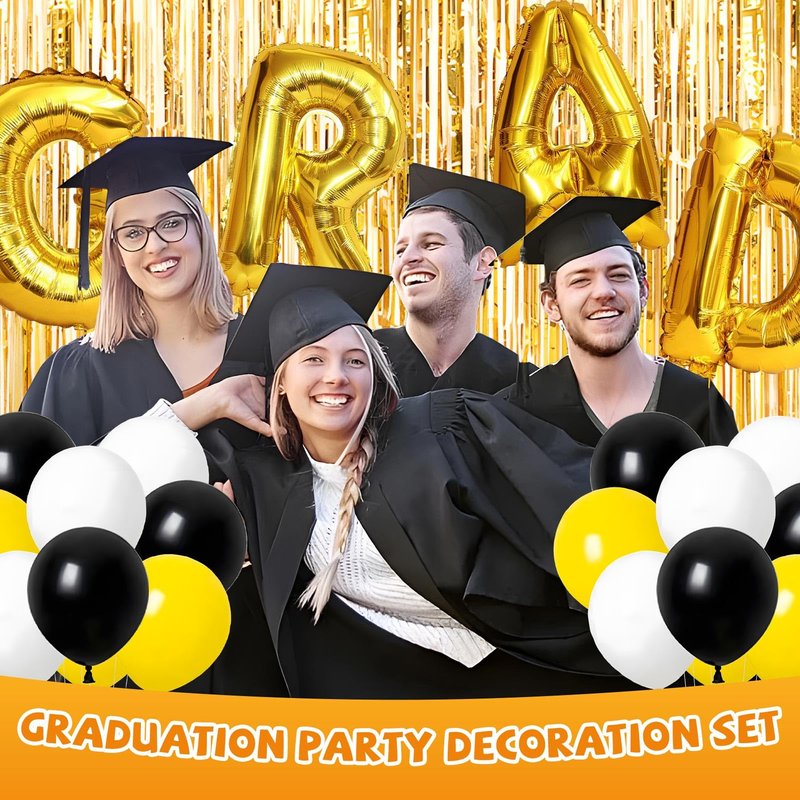 - Premium Quality - Our Graduation party balloons are made of natural latex. High quality eco-friendly material. NOT-EASY BURST and safe to use. Can be filled with air or helium. Graduation backdrop adopt thick cloth fabric,these have the advantages of waterproof,easy to wipe,dirt resistance and durability, safe to use and can be reused many times. Our party sets are very versatile, will not disturb the environment over to create one of a kind party displays.