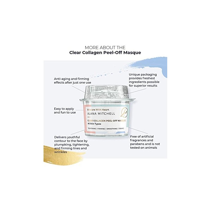 Alana Mitchell Clear Collagen Peel-Off Masque (0.63 oz): This collagen mask for women and men is the first step in putting your best face forward! Our face peel off mask reduces the appearance of wrinkles and fine lines, removes impurities, and delivers instant smoothing results. The unique formula of our deep cleansing mask features hydrolyzed collagen to hydrate the skin, radish root ferment for moisturization, and antioxidant-rich Vitamin E for a smoothing effect. Our collagen face masks for women are easy to use, fun to apply, and relaxing! Suitable for all skin types, our hydrating face mask is the perfect skin perk-me-up for treating yourself, traveling, or a night out on the town. --- How to Use: Apply this wrinkle remover for face peel off mask to a freshly-cleansed face using upward strokes. After popping the top, stir the mixture until fully dissolved. Leave the tightening face mask for skin on for 15-30 minutes, until fully dry, and peel off to remove. --- About Us: Since 2005, Alana Mitchell has developed an excellent reputation for providing one of the best selections of skincare tools and products available. No matter what sort of skin type you have, our goal is to provide you with realistic, innovative, and effective anti aging skin care products that you can rely on.