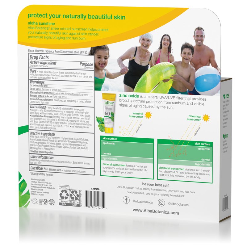 - Help prevent sun damage and premature signs of aging with Alba Botanica SPF 50 Sheer Mineral Lotion