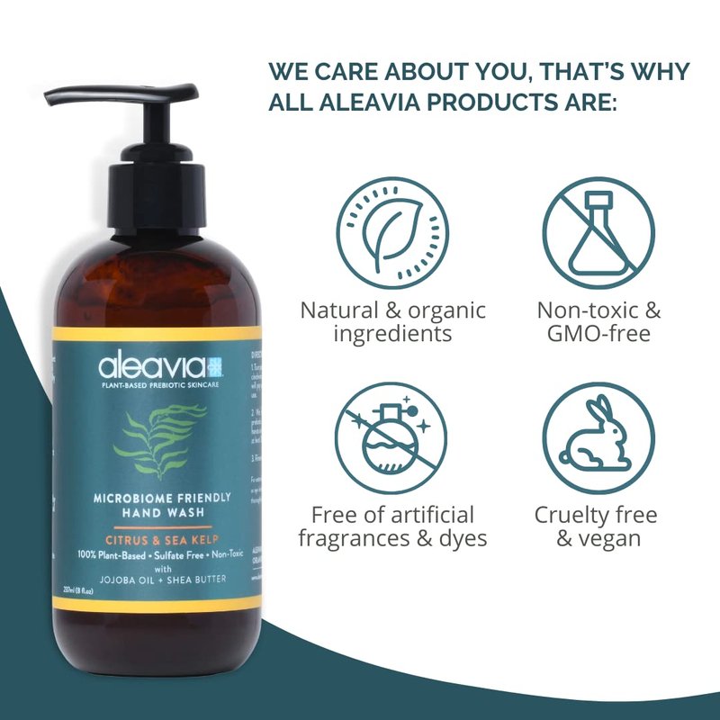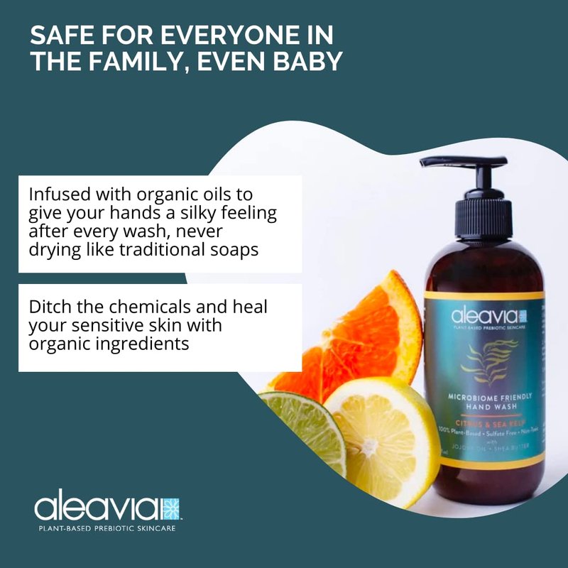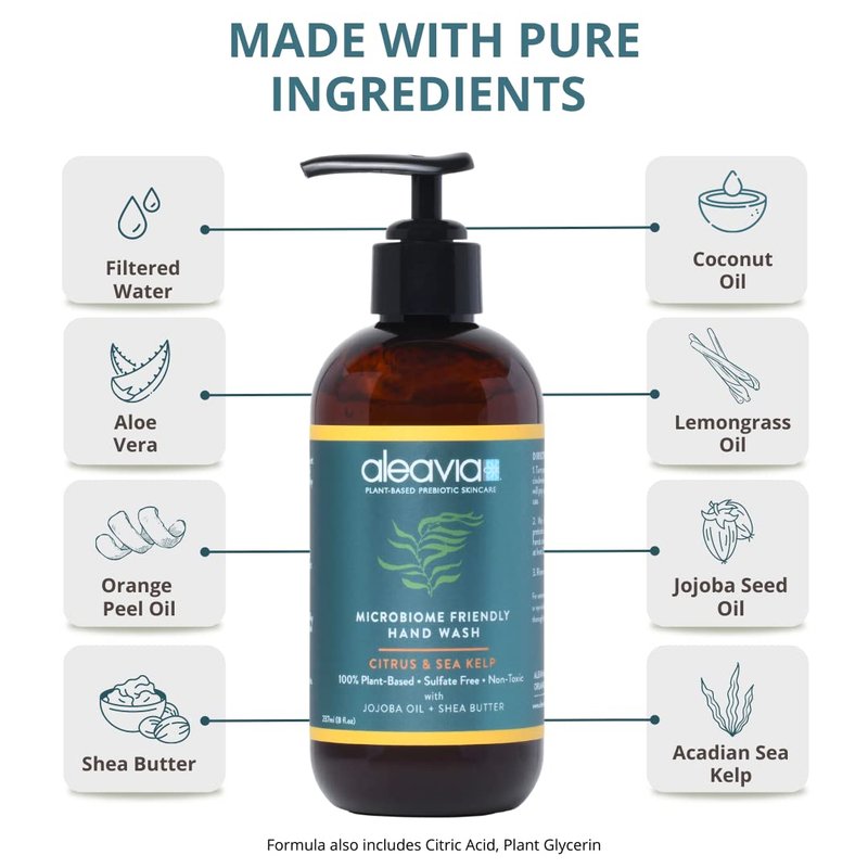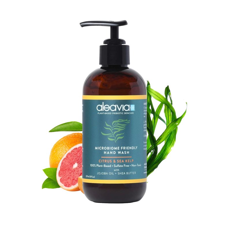- CITRUS AND SEA KELP - Aleavia’s first microbiome-friendly hand wash is here, with a great fresh scent! Our exclusive prebiotic wash is packed full of prebiotics to nourish and feed the beneficial microbiome on your hands to keep your skin’s ecosystem healthy and thriving. As we continue to strip our first layer of defense by over sanitizing, the skin loses the ability to protect against invaders to keep your largest organ healthy.