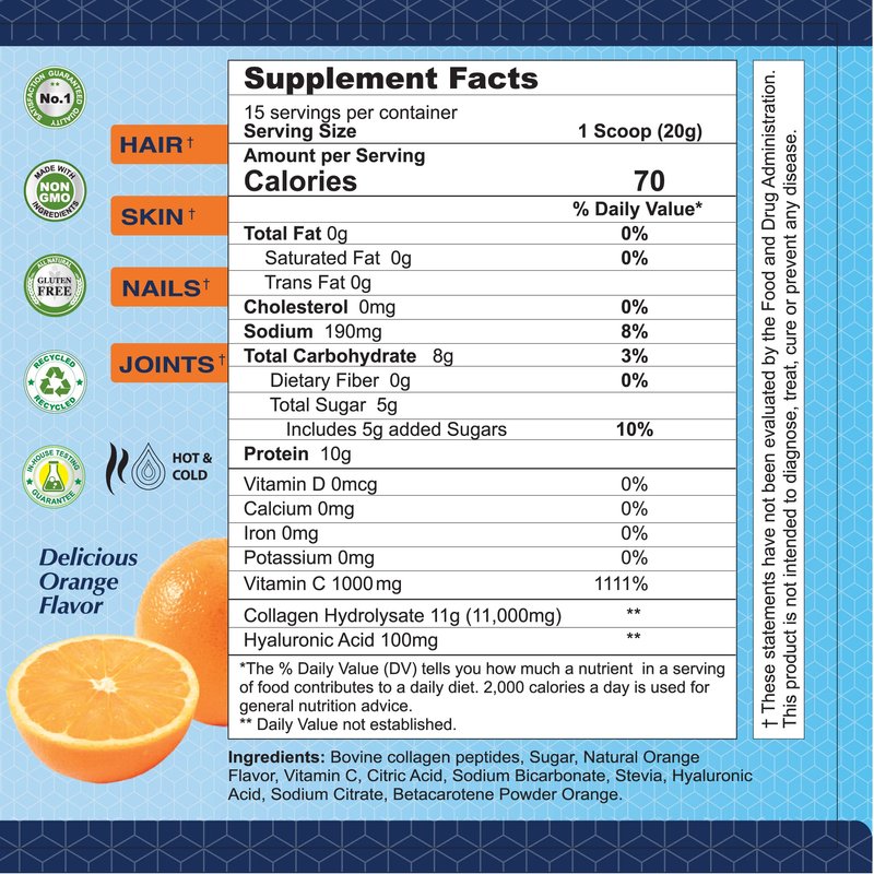 - Collagen is one of the most nutrient-rich proteins in the human body. Supplementing with CollagenC Peptides offers: 11g collagen per, Collagen and hyaluronic Acid ingredients, Gluten Free, Dairy Free, Paleo Friendly, Natural Orange Flavor