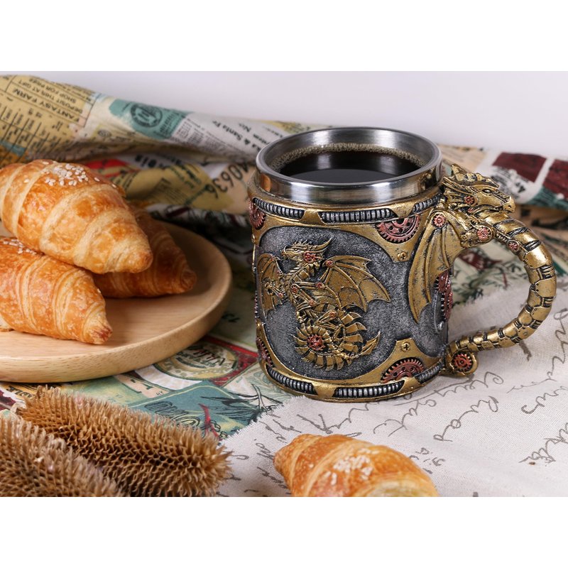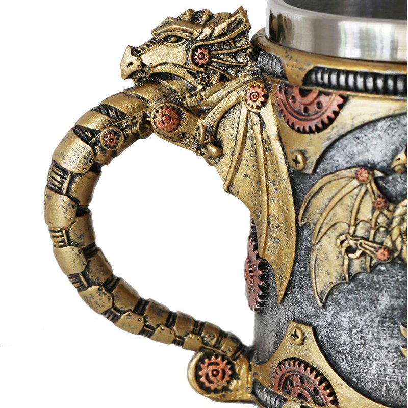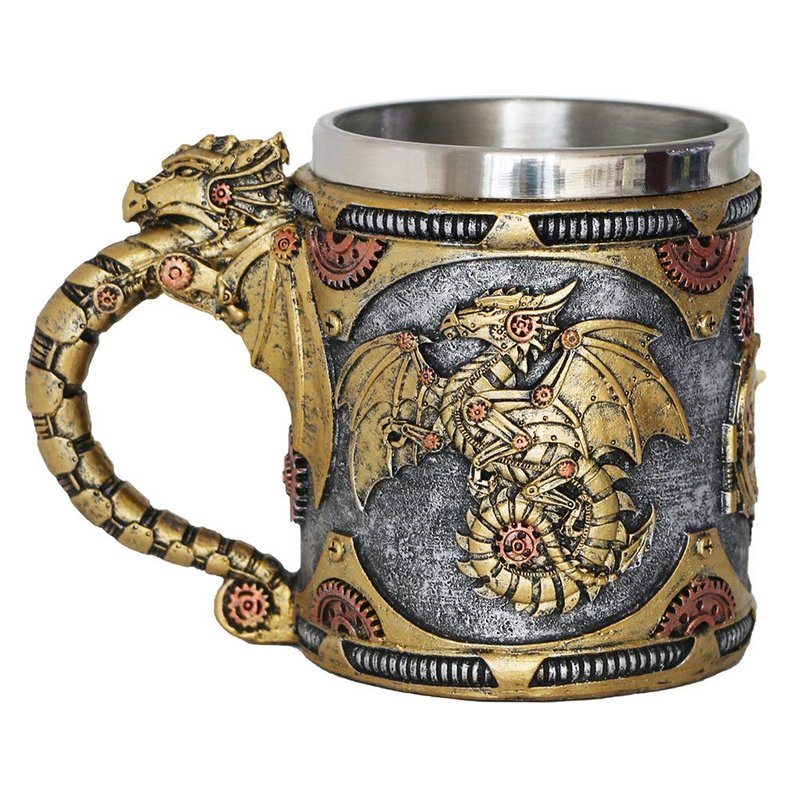 - BEAUTIFUL HAND PAINTED - Retro golden steampunk mechanical Fire Wheel dragon design.You can see antique gears, pipes and other steampunk mechanical components sculpted and painted on the surface of the mug. The intricate details on handle and body of the mug are truly eye-catching