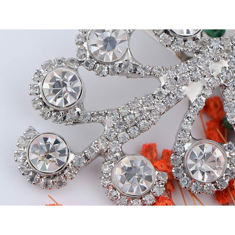 A darling silvery tone flower leaf hair comb that is embedded with clear crystal rhinestones and beads throughout. Amazing hair comb perfect for the most formal of occasions.