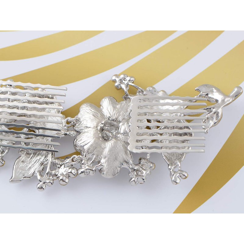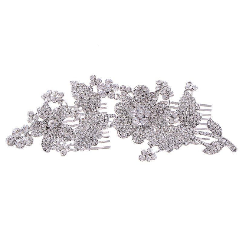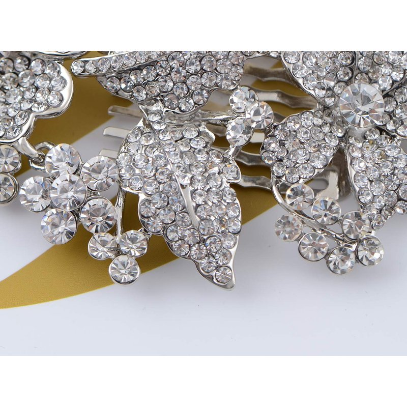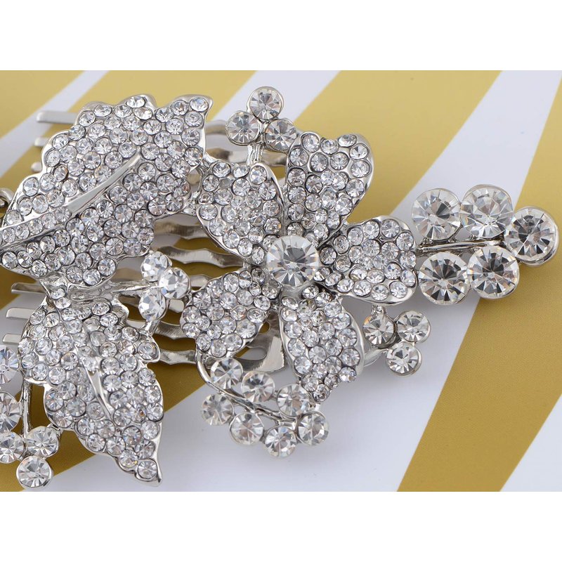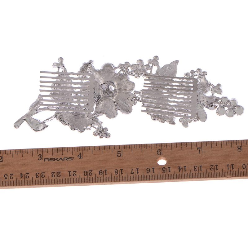 - Details: elegant hinge hair combs featuring clear rhinestone encrusted flowers and leaves. Silver tone metal alloy base 3 3/4" width X 1/2" height