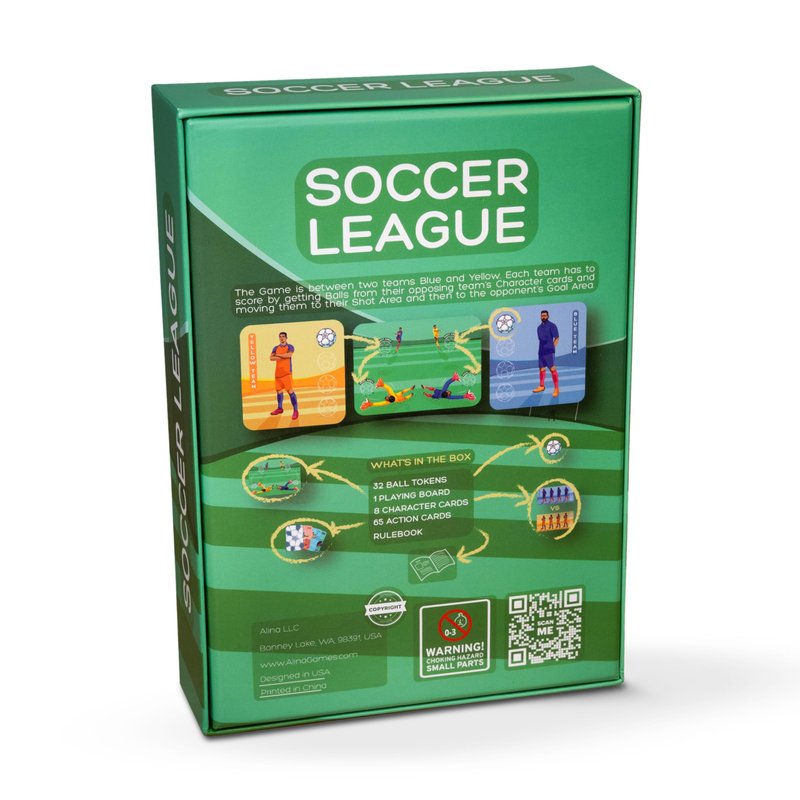 Soccer League is a super fun and quality game! Players collect and play cards to shoot the Balls from an opposing team's cards to a Goal Area to score and win! For 2 to 8 players ages 6 and older. Playing time 20-60 minutes. Comes with: 1 Playing Board, 65 Colored Action Cards, 8 Character Cards, 32 Ball tokens, and a Rules booklet.